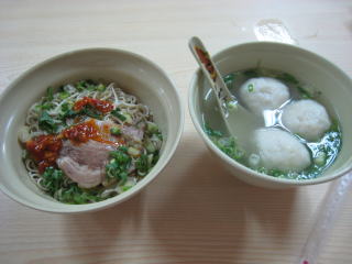 ![]() で、招杯乾判麺(45元)と魚丸湯(40元)。いずれも昨年より5元値上がりしました。でも旨いって!! |